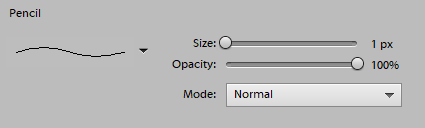 - Выберите инструмент «Карандаш» и установите его размер на 1 пиксель и непрозрачность на 100%.