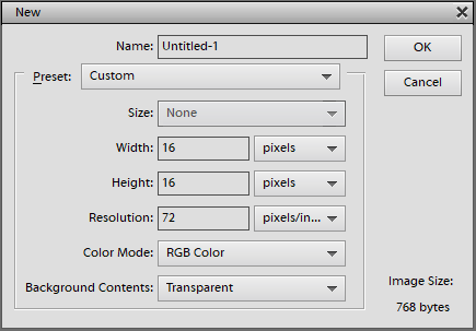 - Установите ширину и высоту на что-нибудь маленькое (в моем случае я начну с создания плитки земли, поэтому ширина и высота установлены на 16).