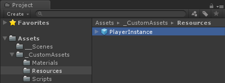 - Сохраните PlayerInstance в Prefab и переместите его в папку Resources (если такой папки нет, создайте ее). Этот шаг необходим для создания многопользовательских объектов по сети.