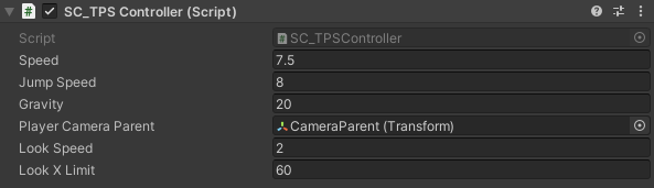 }- Прикрепите скрипт SC_TPSController к объекту "Player" (вы заметите, что он также добавил еще один компонент под названием «Character Controller». Измените его центральное значение на (0, 1, 0))