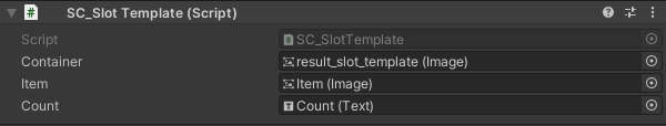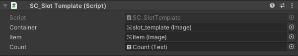 - Прикрепите скрипт SC_SlotTemplate к объекту "slot_template" и назначьте его переменные (компонент изображения в том же объекте передается в переменную "Container", дочернее изображение "Item" передается в переменную "Item", а дочернее "Count" Текст переходит в переменную "Count")