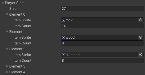 Чтобы добавить предмет в каждый слот, нам нужно присвоить спрайт предмета переменной "Item Sprite" и установить для "Item Count" любое положительное число (все, что меньше 1 и/или не стекируемые элементы, будет интерпретироваться как 1).: