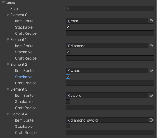 "Stackable" Переменная контролирует, можно ли складывать предметы вместе в один слот (например, вы можете разрешить штабелирование только для простых материалов, таких как камень, алмаз и дерево).