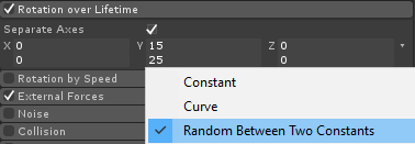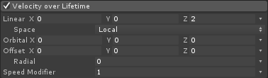 - В системе частиц включите эти модули: Эмиссия, Форма, Скорость в течение срока службы, Цвет в течение срока службы, Размер в течение срока службы , Вращение за время жизни, Внешние силы, Рендерер.
